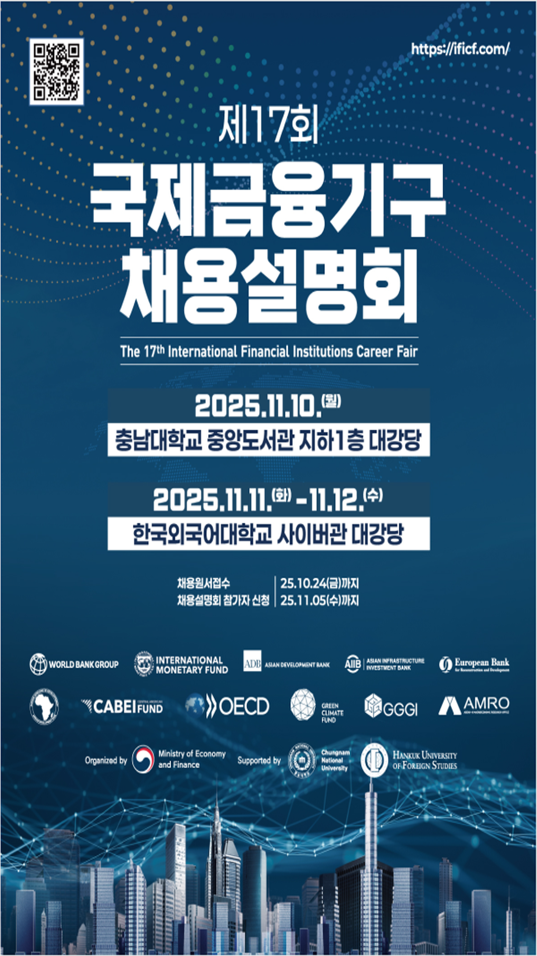국제금융기구를 이해하여 다양한 국제금융기구로 진출을 지원하기 위해 기획재정부에서 주최․주관하는 「제17회 국제금융기구 채용설명회」를 개최함을 안내 드립니다. 1. 행사 개요 가. 행 사 명: 제17회 국제금융기구 채용설명회 나. 일 시: 2025. 11. 10.(월) 13:30~17:00 다. 장 소: 충남대학교 중앙도서관 지하1층 대강당 라. 대 상: 국제금융기구 취업에 관심이 있는 대한민국 국민 마. 주요내용: 11개 국제금융기구 프레젠테이션, 기구별 심층 세션, 한국인 직원과의 Q&A ※ 경제협력개발기구(OECD), 국제통화기금(IMF), 글로벌녹색성장기구(GGGI), 녹색기후기금(GCF), 세계은행그룹(WBG), 아세안+3 거시경제조사기구(AMRO), 아시아개발은행(ADB), 아시아인프라투자은행(AIIB), 아프리카 개발은행(AfDB), 유럽부흥개발은행(EBRD), 중미경제통합은행(CABEI) 2. 신청방법 및 기간 가. 방법: 모두 신청 필수 1) 학사지원시스템: https://with.cnu.ac.kr/index.do 2) 국제금융채용설명회 홈페이지: http://ificf.com 나. 기간: 2025. 11. 5.(수) 18:00까지 다. 문의: 인재개발원 이선화(042-821-5083) |